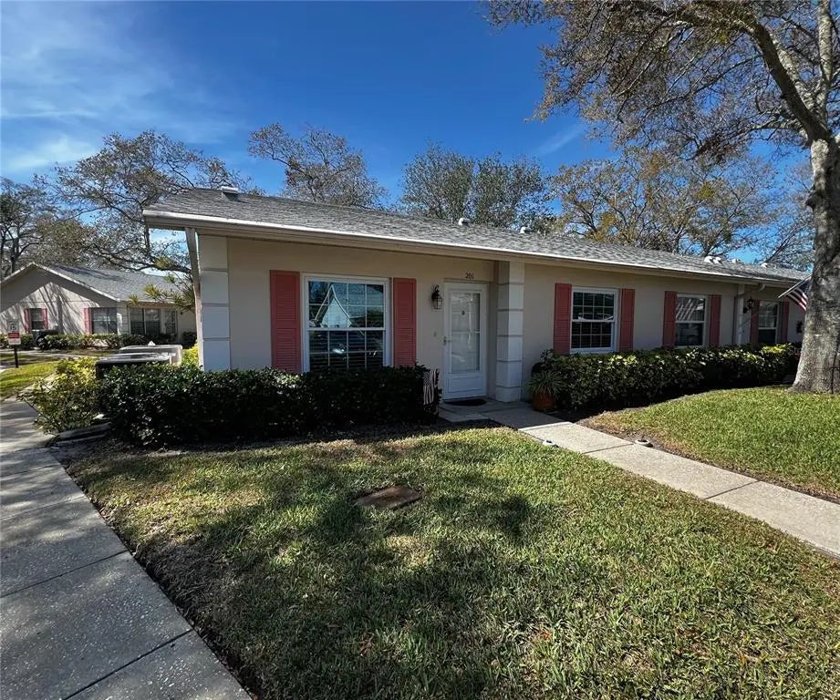 Welcome to Nelson Place- a highly sought after 55+ community in Clearwater that features ground floor villa style condos (with no upstairs neighbors), beautiful mature oak trees and landscaping, and is walkable to a Publix shopping center with a variety of stores. Enjoy the peace of mind being in a non-flood zone (Zone X)! This ground floor end unit has been meticulously maintained, and is highlighted by a wall of windows that bring in bright natural light throughout the entire condo. This villa has updated windows, a newer water heater, and boasts an open floor plan with two bedrooms and two bathrooms, a sunny Florida room, plus a back patio for enjoying the Florida weather or planting your favorite plants. The kitchen has an opening that is perfect for bar stool seating, plus space for a breakfast table. The living and dining room combo feature laminate flooring, a vaulted ceiling, and leads into the sunny Florida room at the rear of the condo. You also have a paver patio with space for seating, a grill, and your favorite plants. Both bedrooms have a window for natural light, and spacious walk in closets. The guest bathroom connects to the guest bedroom through a hallway that can be shut off from the main living space for a more private/ suite like feel, and the primary bedroom has a private attached bathroom with a walk-in shower. There is also an attic space for additional storage and a sturdy pull down ladder. Enjoy the little things, like a spacious inside laundry closet, covered parking just steps from your door, a heated and spacious pool with plenty of lounge chairs to enjoy the sunshine, and a smaller community with just 31 condos. Publix is a short walk around the corner plus shops, restaurants, nail salon, gym, etc. Eagle Lake Park is a short drive from the community, as well as Clearwater Beach and both Tampa and St Pete/ Clearwater airports. This central Pinellas location is the perfect home base for you as you enjoy the best of Tampa Bay with our award winning beaches, shopping, restaurants, and golf. Don't miss out on this wonderful condo! Please note: no dogs allowed, only one cat or bird.