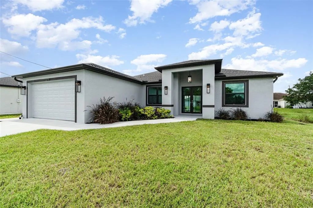 Welcome to your dream home, a brand-new construction in a prime central location in Lehigh Acres. This home offers a perfect mix of luxury, style, and convenience, built with exceptional quality and attention to detail. It's designed for modern living and peace of mind. This spacious 3-bedroom, 2-bathroom residence features a versatile den that's perfect for a home office or cozy reading nook. The split floor plan ensures privacy, with the luxurious primary suite tucked away on one side of the home. The primary suite is a true retreat, boasting an elegant tray ceiling and two spacious walk-in closets. In the spa-like primary bathroom, you can relax in a standalone soaking tub or enjoy the sleek, frameless shower. The bathroom also features two separate sinks and vanities, along with a private water closet. The heart of the home is the chef's kitchen, which features high-end GE brand stainless steel appliances, elegant quartz countertops, and soft-close cabinetry with a beautiful tiled backsplash. This space flows seamlessly into the large great room, making it ideal for entertaining. Throughout the home, you'll find 8-foot doors, decorative lighting and fans, and stunning large tile flooring. The living room also has a tray ceiling, adding an extra touch of sophistication. Beyond the stunning interior, you'll find top-of-the-line features for comfort and security. Hurricane impact windows and doors provide superior protection and energy efficiency. The exterior features a beautifully landscaped yard with lawn irrigation, which you can view from the screened-in lanai. The builder even added an integrated pest control system, allowing for easy access and a pest-free home. This fantastic location puts you close to everything you need. You're just a short drive from RSW International Airport, SR-82, and I-75, making travel a breeze. Enjoy the excitement of Spring Training for the Boston Red Sox and Minnesota Twins, or explore the area's excellent shopping and dining. When you're ready for a day in the sun, the beautiful Gulf Coast beaches are not far away. This home is more than just a place to live—it's a lifestyle. Come see what makes this brand-new home so special.