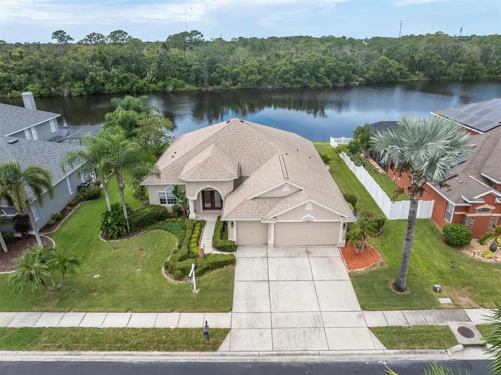One or more photo(s) has been virtually staged. Waterfront Elegance in the Heart of Trinity! At this price, it wont last. Close enough to the Gulf but NO Flood zone. Neighborhood and streets surrounding never get flooded since they built it all on higher elevation. Welcome to your Florida dream home in one of the most sought-after gated communities in the Trinity/New Port Richey area — where every day feels like a vacation! This stunning 4-bedroom, 3-bath, 3-car garage pool home is perfectly perched on the water with peaceful conservation views and no rear neighbors — offering you the ultimate in privacy and serenity making this one of the most premium desired lots in the whole community. Inside, you'll be greeted with over 11 feet of soaring ceilings, smartly designed tri-split floor plan that offers both functionality and privacy for the whole family. The heart of the home features a spacious eat-in kitchen adorned with rich solid wood cabinetry and gorgeous granite countertops, perfect for cooking up memories. Entertain in style with a formal dining area, a welcoming living room, and a versatile great room — there's space for everyone and everything! Step outside to your personal paradise: a sparkling screened-in pool (just resurfaced) overlooking tranquil waters and lush conservation land. Unwind in the evenings with a front-row seat to breathtaking sunsets from your very own backyard. You will find an extended lanai outside the screens completed with pavers and a fire pit for those cooler cozy nights. Roof 5 yrs new. BONUS: This exclusive community offers a private community boat ramp, playground and park area, perfect for weekend adventures on the water! Zoned for A-rated schools, No CDD fees, Low HOA, No flood insurance required Conveniently close to hospitals, top-rated restaurants, shopping, and just 15 minutes from the beach! Don't miss your chance to own this slice of Florida paradise — homes like this don’t come around often!